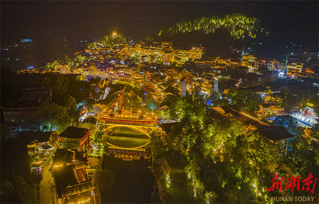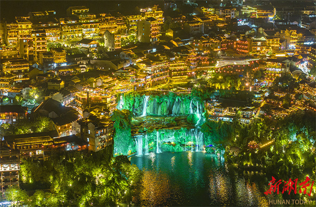 On the evening of September 22, Furong Town Scenic Area in Yongshun County was ablaze with dazzling lights, where waterfalls and ancient architecture complemented each other beautifully under the illumination. In recent years, the scenic area has developed its night economy, creating immersive nighttime experiences that have propelled the vigorous growth of its cultural and tourism industry. (Photo/Tong Zhenxi, Hunan Daily)