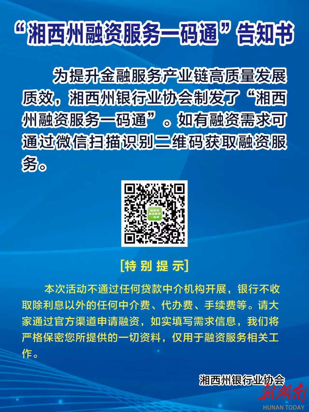湖南日报·新湖南客户端9月25日讯(记者 李菁菁 通讯员 向月姣)近日,湘西土家族苗族自治州银行业协会上线“湘西州融资服务一码通”平台。该平台以“一码直达、一键申请”为核心,旨在打通融资服务“最后一公里”,为全州经营主体提供便捷、高效、安全的官方融资渠道。