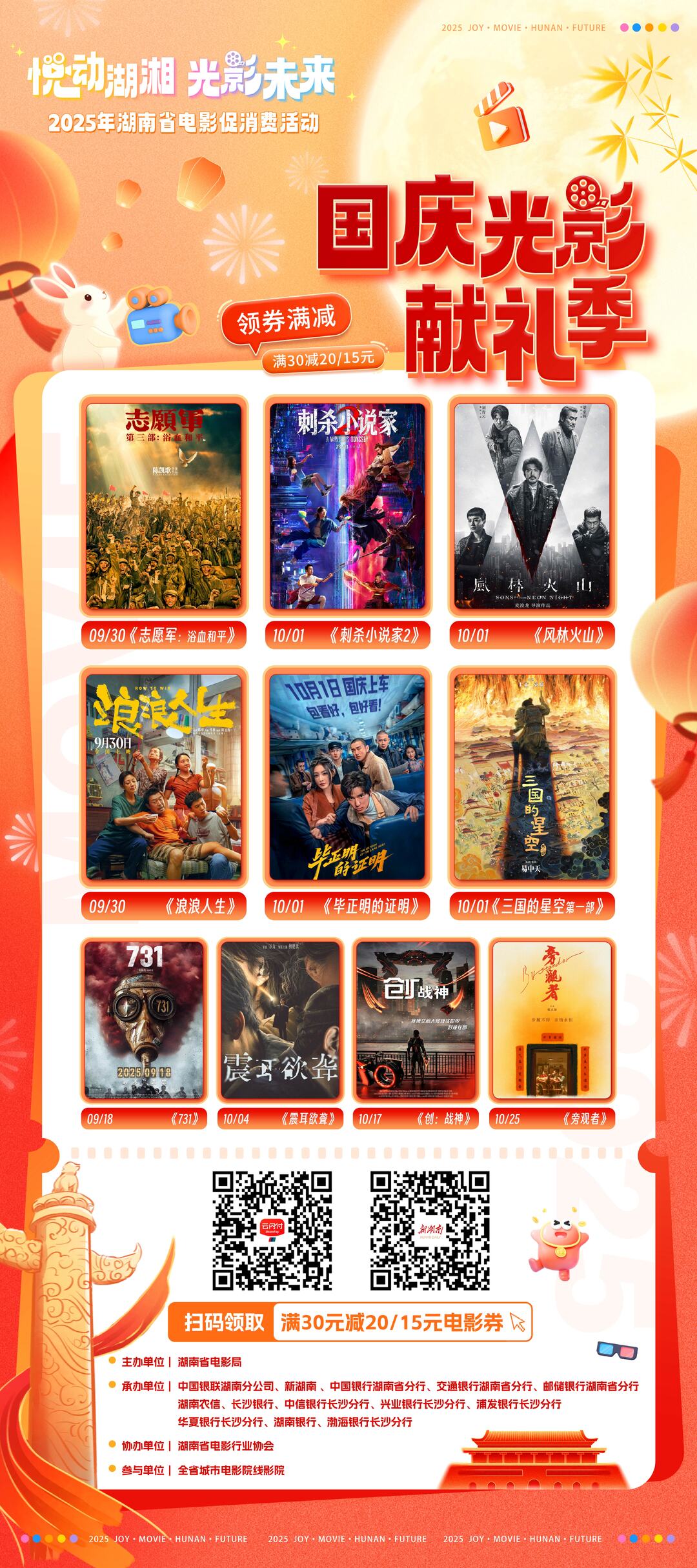 本次活动由湖南省电影局牵头主办,旨在以“真金白银”的补贴激发电影市场活力,丰富市民的假日文化生活。活动力度颇具吸引力,主打的“满30元减20/15元”消费券,意味着观众能以极优惠的价格欣赏到国庆档的院线大片。