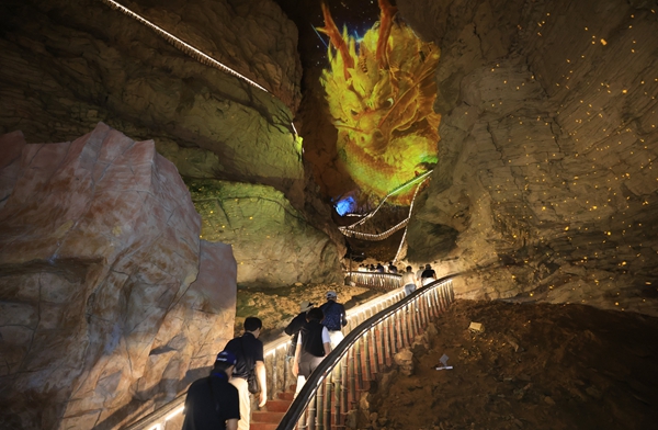 其余景区的特色活动同样亮点纷呈。10月1日至6日,黄龙洞景区推出“月满华诞・龙耀洞天”主题活动,民族服饰走秀、“龙王寻踪”NPC互动、洞内码头民俗表演搬进亿万年地质奇观中,让游客在溶洞秘境里感受民俗魅力;同期,千古情景区举办火人狂欢节,《祭火拜月大典》《打铁花》《水上火壶》等节目以“中式火焰美学”为核心,融合非遗绝技与科技元素,打造沉浸式感官盛宴。