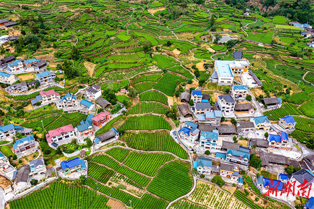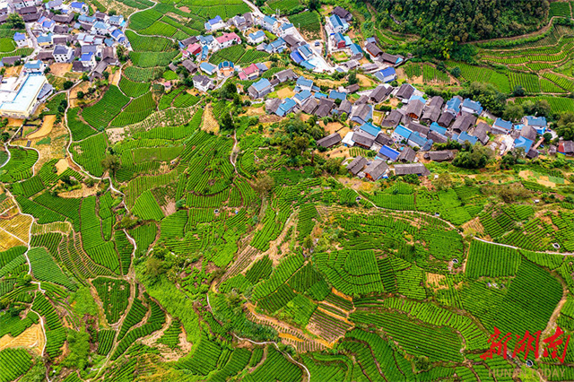 The photo shows a vast expansion of tea plantation stretching across the undulating terrain at Aikou Village, Majing'ao Town, Jishou City, blending harmoniously with local residences. This presents the distinctive charm of tea plantation in the Wuling Mountain area. (Photo/Liu Zhenjun)