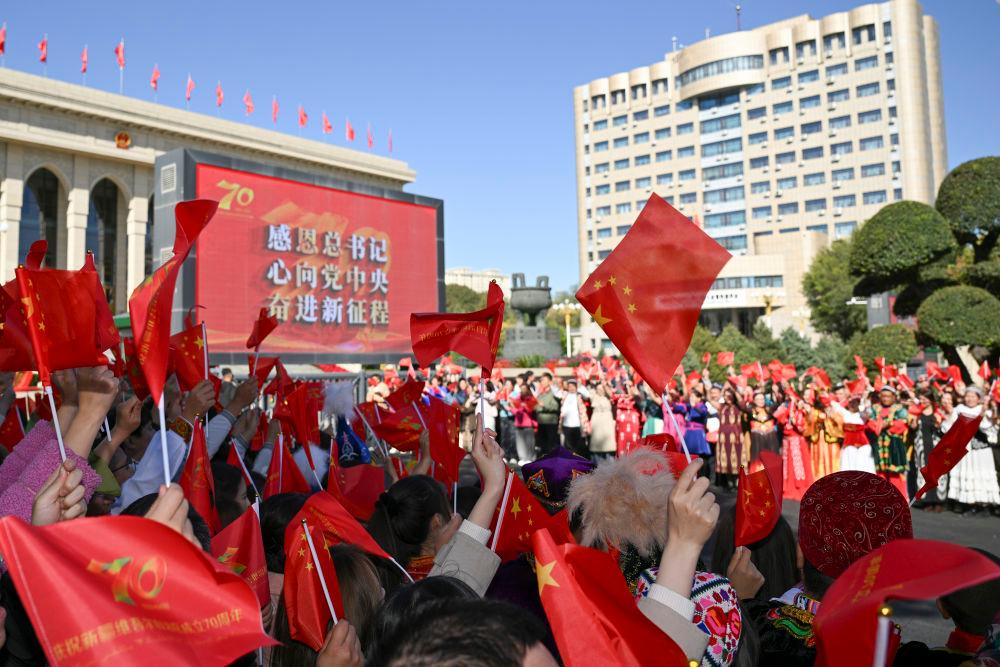 25日上午,习近平总书记在乌鲁木齐市出席新疆维吾尔自治区成立70周年庆祝大会,同新疆各族各界干部群众代表一道,热烈庆祝新疆维吾尔自治区成立70周年。