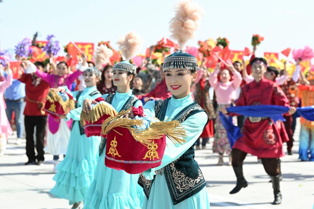 各族群众代表身着民族服饰,载歌载舞,欢迎习近平总书记的到来,表达对总书记的衷心祝福。