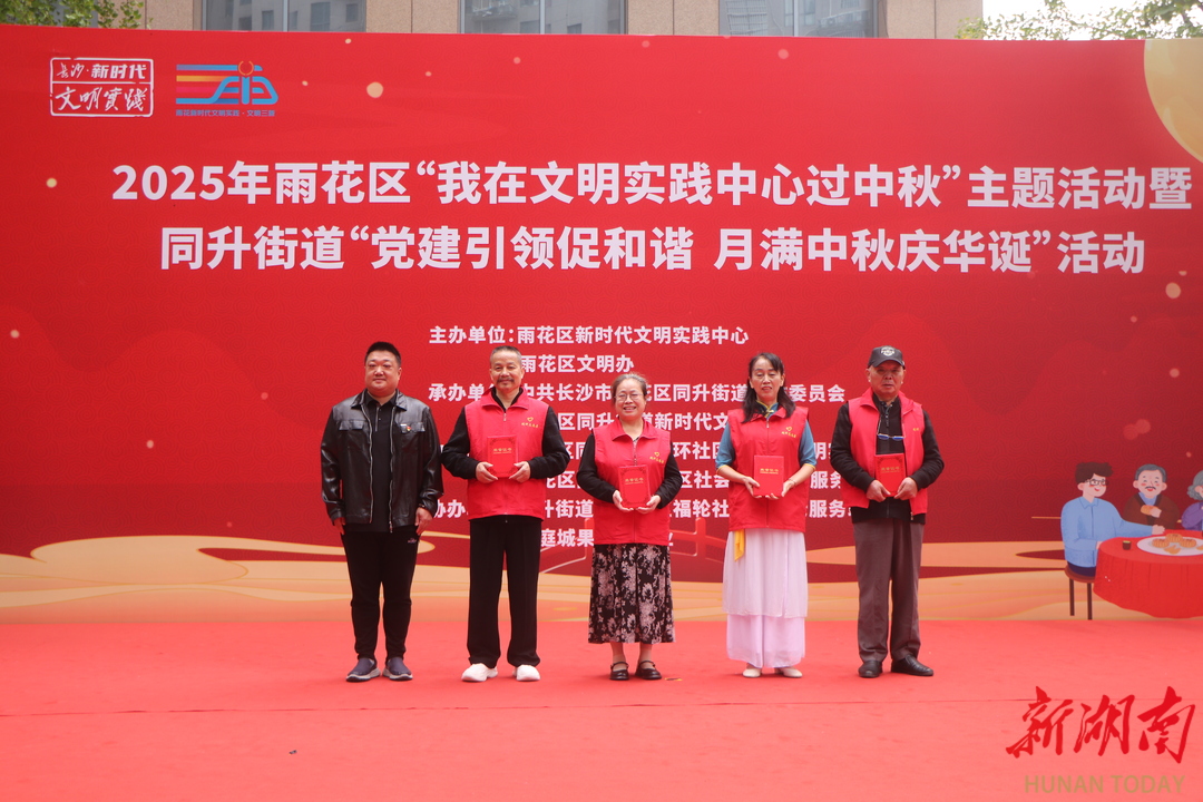 新湖南客户端9月26日讯(通讯员 何芳 赵雨)9月26日上午,长沙市雨花区同升街道景环社区广场上欢声笑语,舞台上歌舞飞扬。在雨花区新时代文明实践中心及雨花区委社会工作部的统筹指导下,2025年雨花区“我在文明实践中心过中秋”主题活动暨同升街道“党建引领促和谐 月满中秋庆华诞”活动隆重举行。活动通过文艺表演、志愿者表彰和游园体验三大环节,吸引数百名各民族居民群众参与,共同感受传统节日的文化魅力与社区邻里的温暖情谊,铸牢中华民族共同体意识及民族团结。