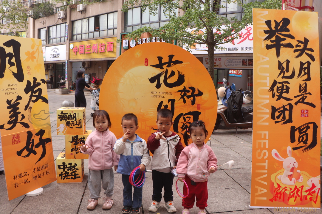 活动现场还设置了“花好月圆”中秋主题拍照区,居民们纷纷手举中秋元素卡通牌在此合影留念,记录下这美好时刻。