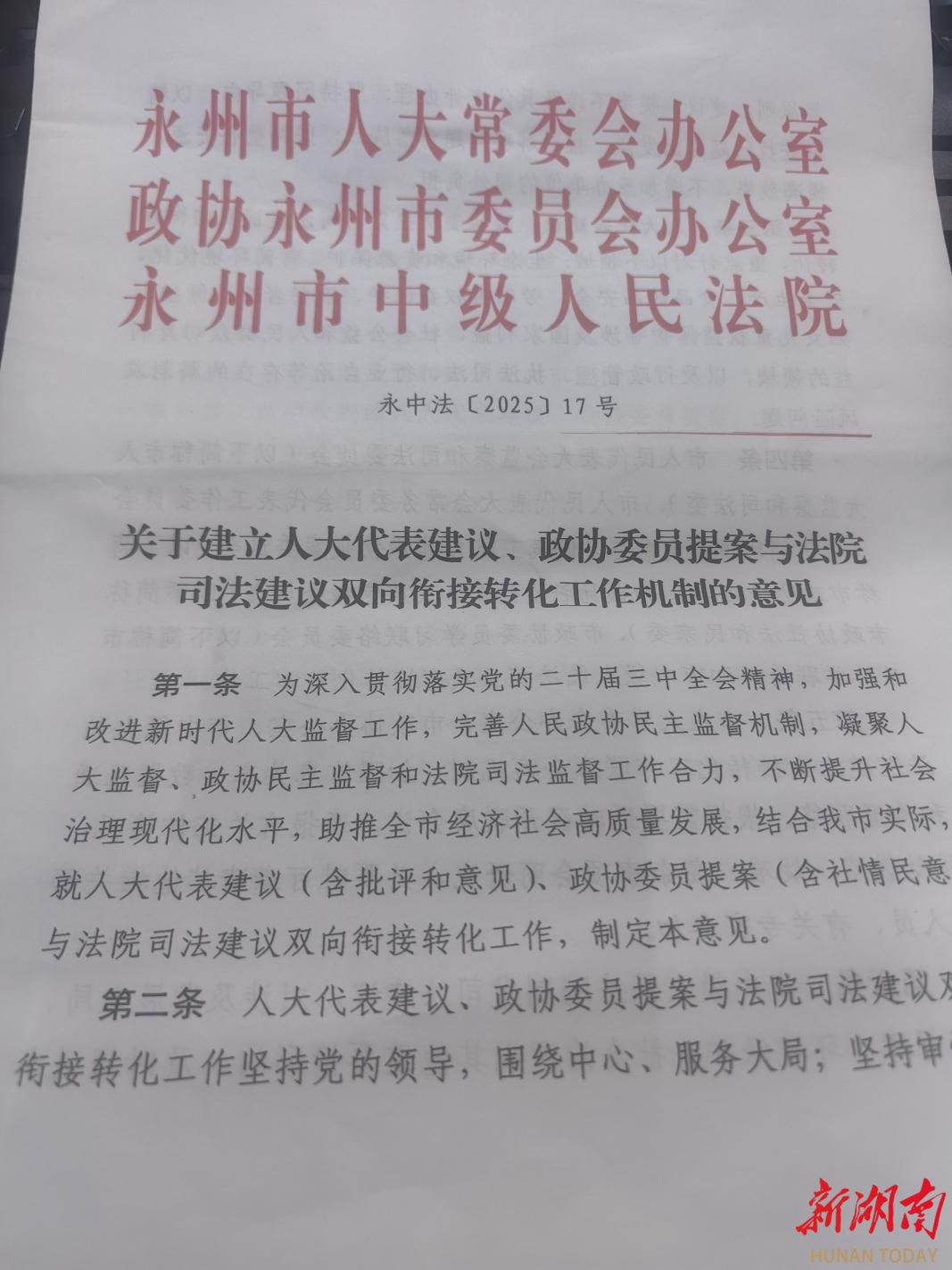 湖南法治报·新湖南客户端讯(通讯员 谢西旎)近日,永州市人大办公室与市政协办公室、市中级人民法院联合出台人大代表建议、政协委员提案与法院司法建议双向衔接转化工作意见。