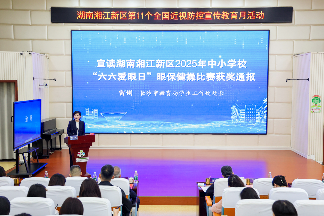 雷俐宣读了“2025年湘江新区中小学校‘六六爱眼日’眼保健操比赛获奖通报”,激励各校以先进为榜样,将日常防护措施做实做细。随后,湖南师范大学附属滨江学校、湖南师范大学附属高新实验小学、岳麓区实验小学三所代表学校分别分享了各校在近视防控方面的特色做法与实践成果,内容涵盖环境优化、课程融合、健康管理等多个维度,为全区学校提供了可借鉴的路径。