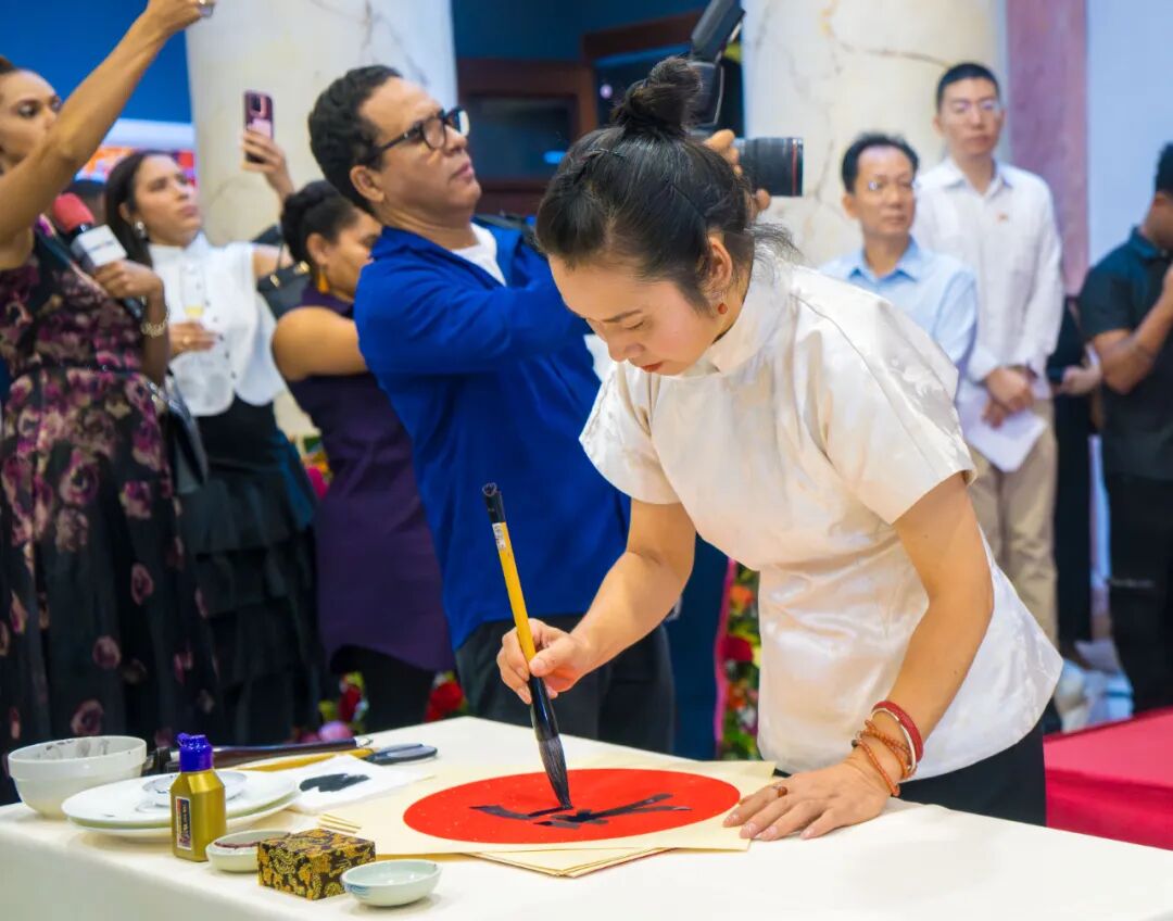 9月24日,驻多米尼加大使陈鲁宁及夫人王鹤鸣在多米尼加艺术宫举行中华人民共和国成立76周年招待会,湖南文联文化交流团开展了首站演出。多米尼加高教部部长加西亚、外交部副部长卡拉瓦略、国防部副部长罗德里格斯、内政警察部副部长费利斯、住建部副部长巴斯克斯,湖南省文联党组书记、副主席乐奕及多米尼加多位国会议员、省市长,各界友人、外国驻多使节和在多中资机构、华侨华人代表等300余人出席,共赏湖湘文化盛宴。湖南文化交流团守正创新,跨界融合,第一次将书法、美术与剑舞融合,实现“一动一静”“一文一武”深度融合,第一次将湖湘原创民乐和服饰完美融合。艺术家的倾情演绎,深受当地民众的喜爱,现场反响热烈。