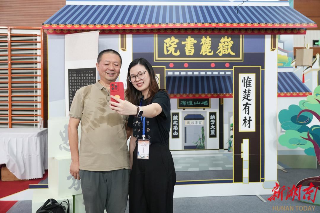 (9月25日,北京外交部体育馆,参展商在岳麓书院模型前合影。湖南日报全媒体记者 辜鹏博 摄)