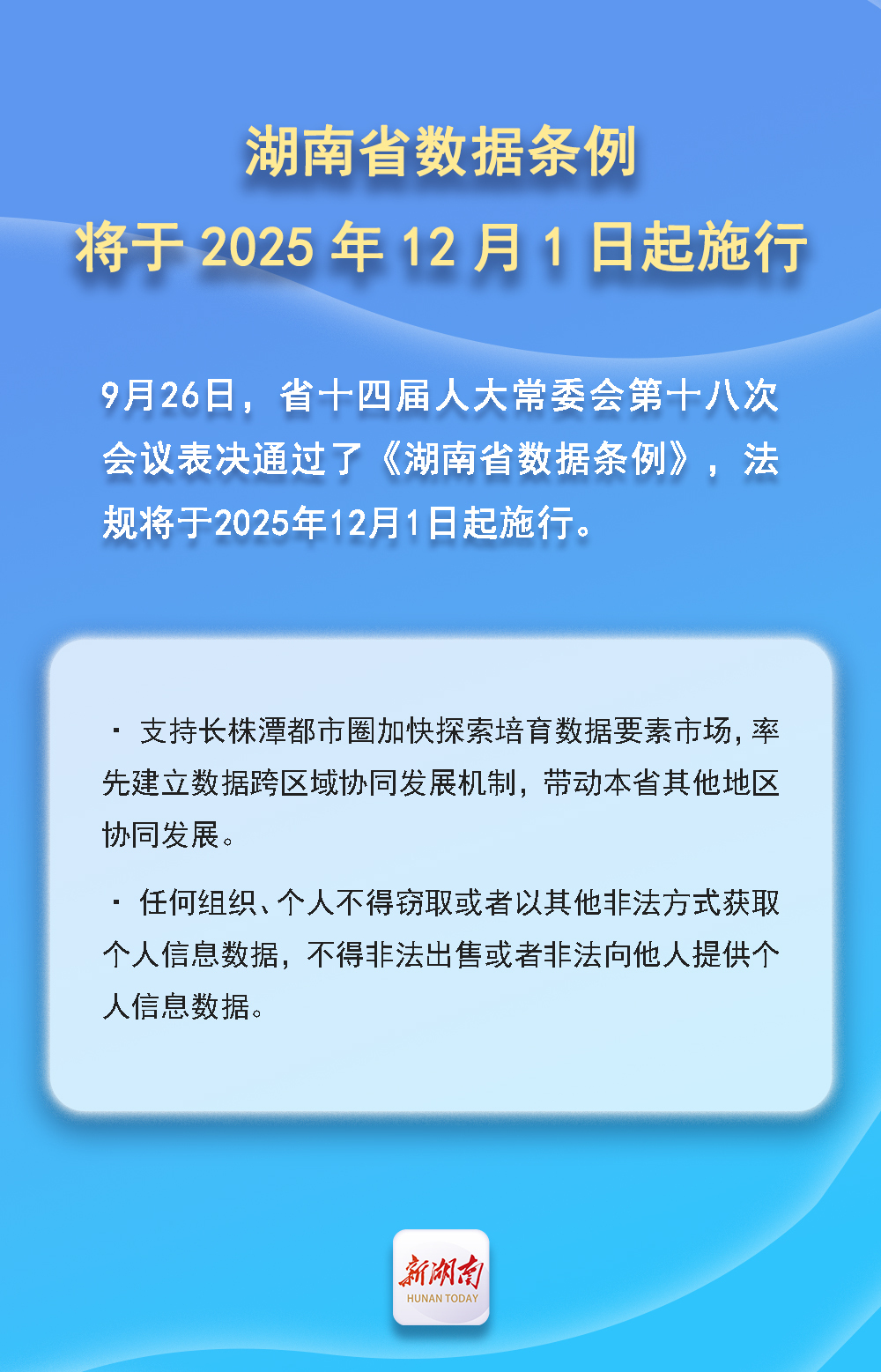 湖南日报·新湖南客户端9月26日讯(记者 郭宸)9月26日,省十四届人大常委会第十八次会议表决通过了《湖南省数据条例》,法规将于2025年12月1日起施行。以下为法规全文: