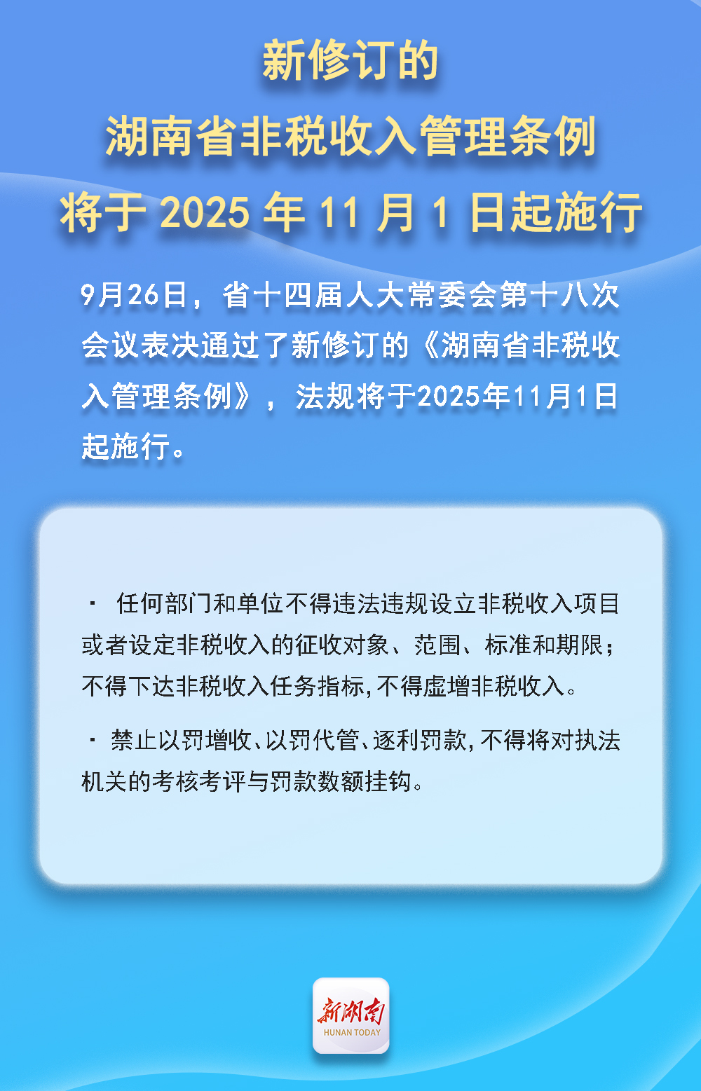 湖南日报·新湖南客户端9月26日讯(记者 郭宸)9月26日,省十四届人大常委会第十八次会议表决通过了新修订的《湖南省非税收入管理条例》,法规将于2025年11月1日起施行。以下为法规全文: