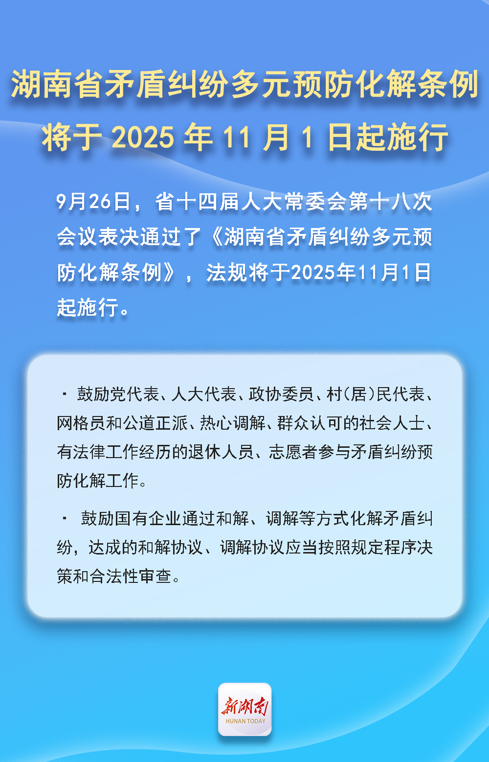 湖南日报·新湖南客户端9月26日讯(记者 郭宸)9月26日,省十四届人大常委会第十八次会议表决通过了《湖南省矛盾纠纷多元预防化解条例》,法规将于2025年11月1日起施行。以下为法规全文: