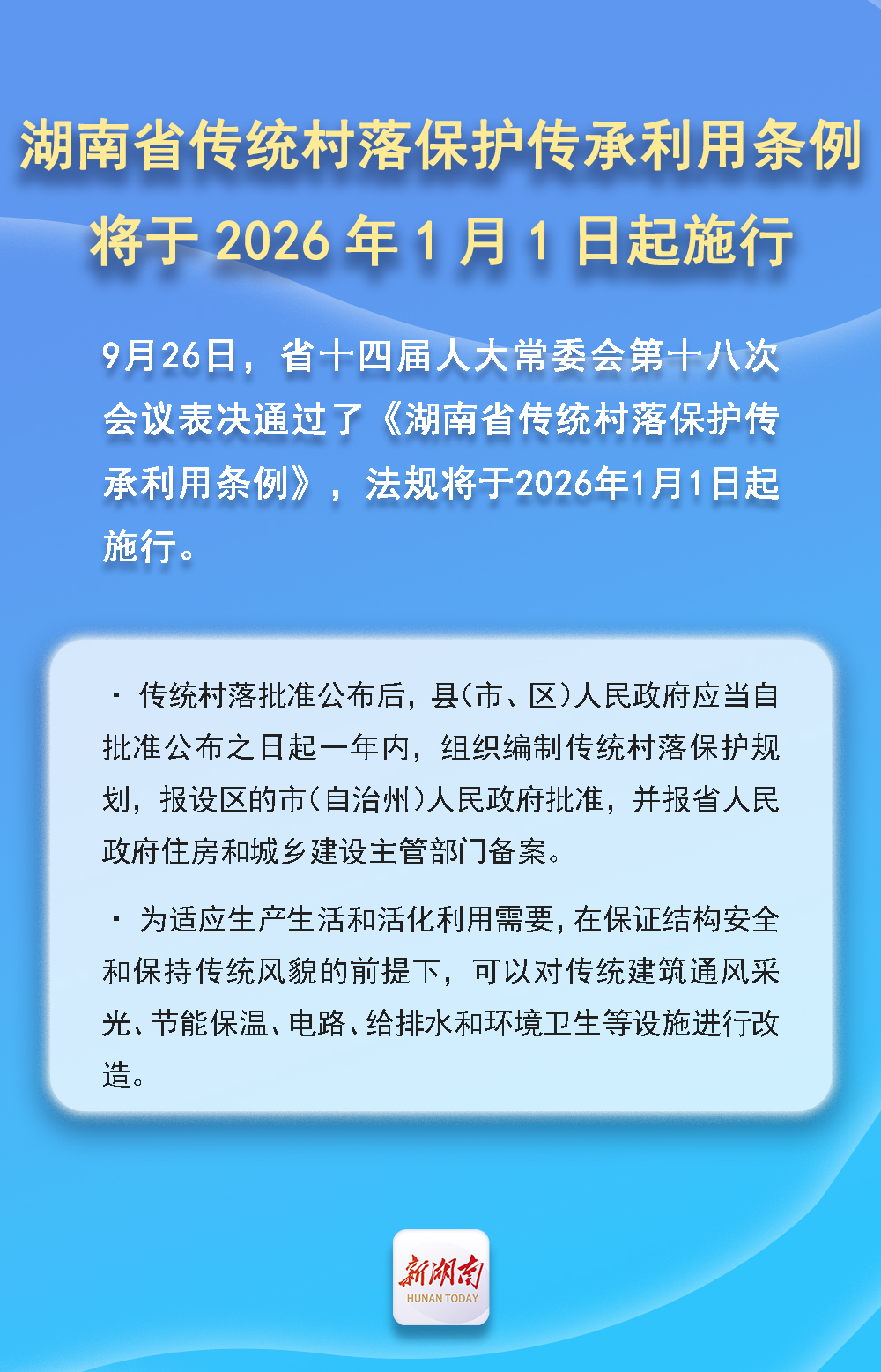 湖南日报·新湖南客户端9月26日讯(记者 郭宸)9月26日,省十四届人大常委会第十八次会议表决通过了《湖南省传统村落保护传承利用条例》,法规将于2026年1月1日起施行。以下为法规全文: