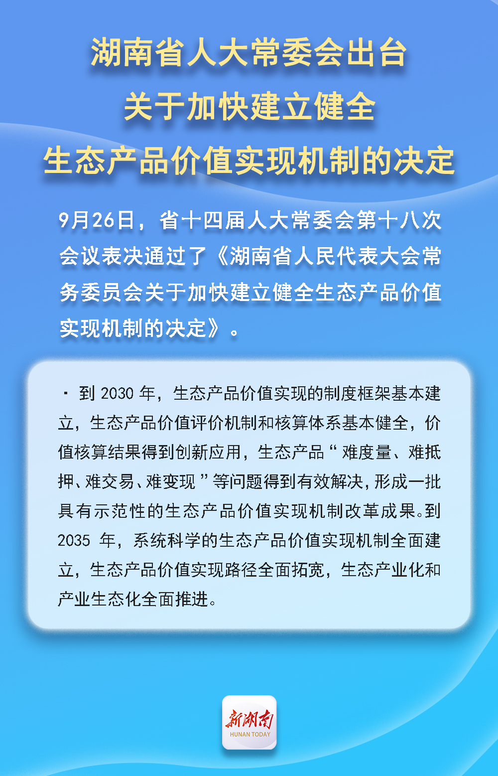 湖南日报·新湖南客户端9月26日讯(记者 郭宸)9月26日,省十四届人大常委会第十八次会议表决通过了《湖南省人民代表大会常务委员会关于加快建立健全生态产品价值实现机制的决定》。以下为决定全文: