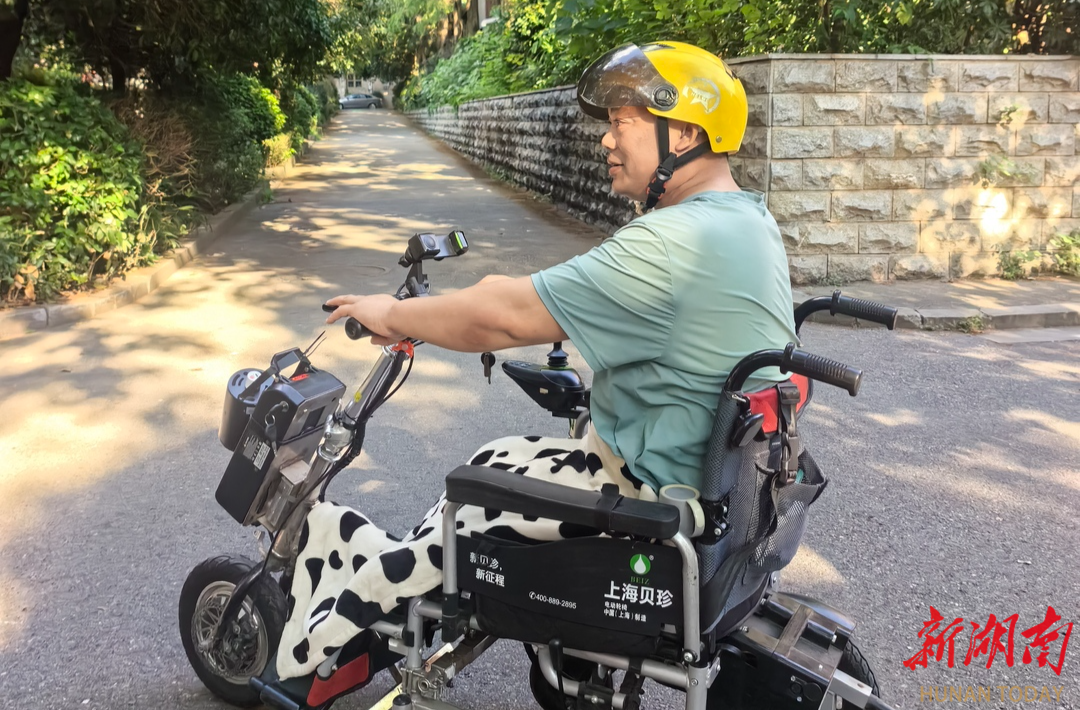 去年9月,为了出行更便利,盛四红搬进了设施齐全的湖南省长沙市芙蓉区鑫远博爱残疾人托养中心,这里食堂、无障碍设施一应俱全,他实现了完全自理,想家时,吃完晚饭打了卡,他把电动轮椅装上车头,就能自己开着回去。