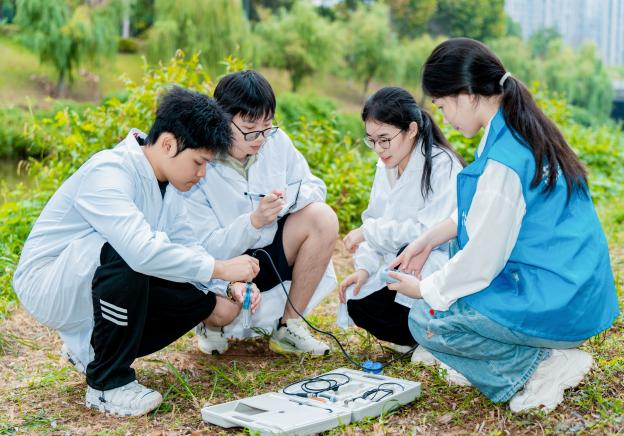 依托生态环境学院研究生第三党支部的专业优势,“绿色卫士”团队还为圭塘河开展了一次“健康体检”。志愿者们熟练操作专业仪器,对圭塘河不同点位水体的pH值、溶解氧等指标进行检测,让专业监测数据成为科普宣传的“活教材”。