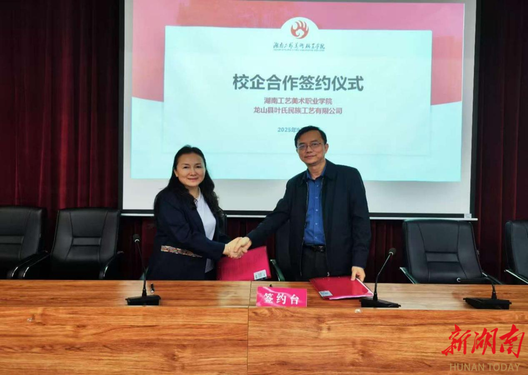 新湖南客户端9月28日讯(通讯员 田华)9月26日,湘西土家族苗族自治州龙山县叶氏民族工艺有限公司与湖南工艺美术职业学院校企合作研发创新协议签约暨“土家织锦文创工坊”揭牌仪式,在益阳举行。