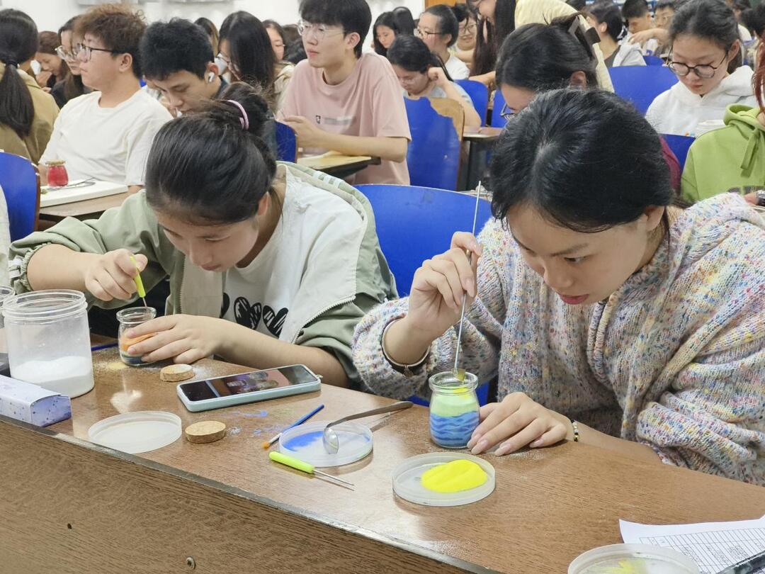 沙画艺术作为新兴的综合性艺术形式,融合绘画、音乐、灯光与舞台表演,以其瞬息万变的视觉魅力深受年轻人喜爱。“沙画不仅是技巧的展现,更是情感的表达。”谭珊珊老师现场指导学生尝试创作,鼓励大家用沙子讲述自己的故事。许多学生首次接触沙画便展现出浓厚兴趣,纷纷表示:“沙画的自由与灵动让人放松,也让我们重新理解了传统文化的现代表达。”