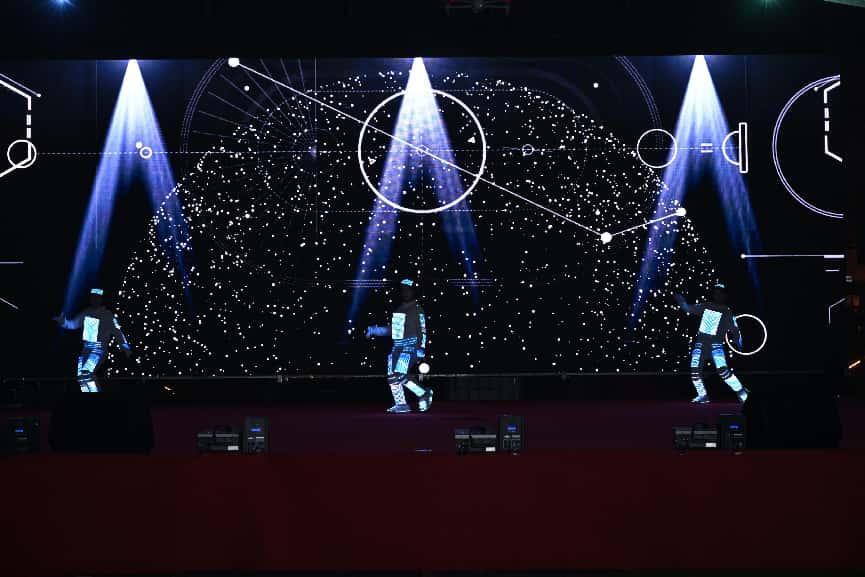 晚会以极具视觉冲击力的灯光秀《燃》拉开序幕。在动感电子音乐的伴奏下,绚丽激光与巨型LED屏交相辉映,构建出虚实交织的赛博空间。