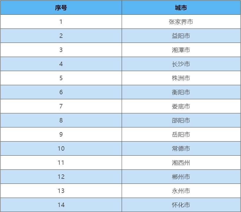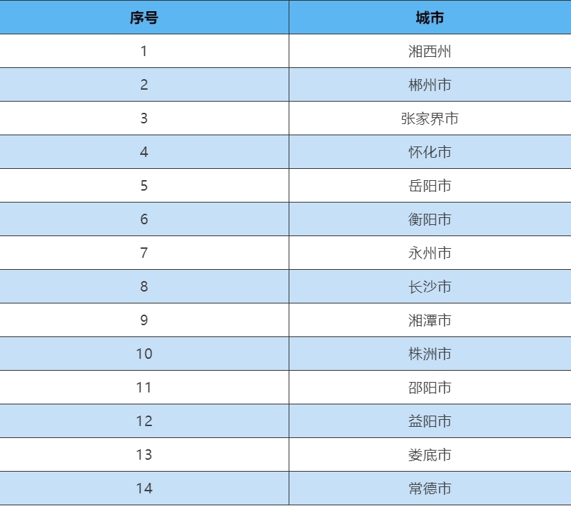 按照城市PM2.5浓度评价,从好到差依次为:湘西州、郴州市、张家界市、怀化市、岳阳市、衡阳市、永州市、长沙市、湘潭市、株洲市、邵阳市、益阳市、娄底市、常德市。