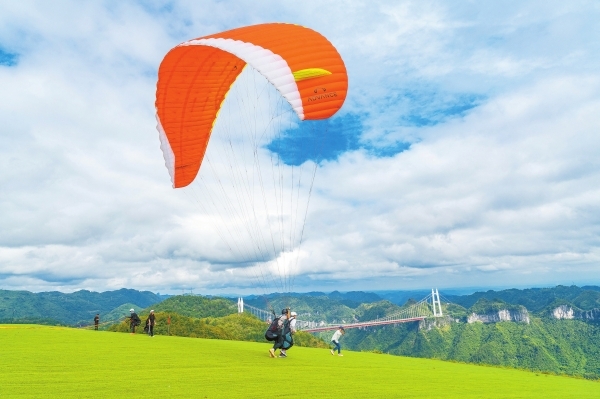 9月27日,吉首市矮寨风景名胜区滑翔营地,游客前来体验空中俯瞰矮寨大桥和苗岭大峡谷的独特视角。为迎接国庆、中秋假期,景区升级营地设施,通过直播引流等方式吸引游客,带动当地文旅消费热潮。梁永鸿 摄(湖南图片库)
