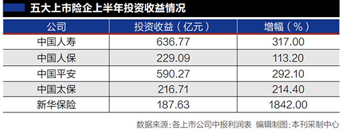 中国人寿上半年实现投资收益636.77亿元,同比增长317%。其中,权益类投资收益贡献突出,股票和基金(不包含货币市场基金)投资规模较去年末增加超过1600亿元,配置比例由去年底的12.18%上升至13.60%。
