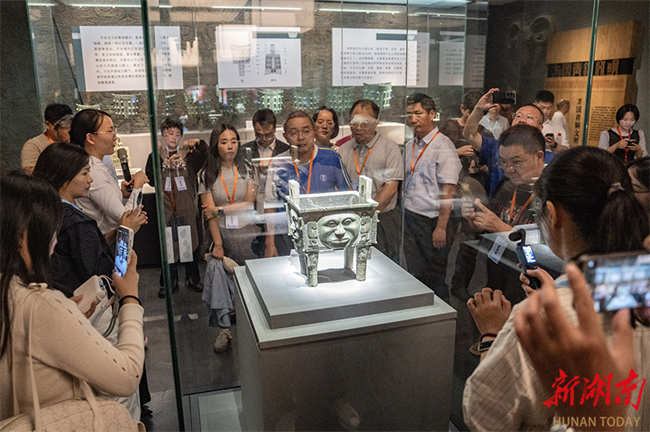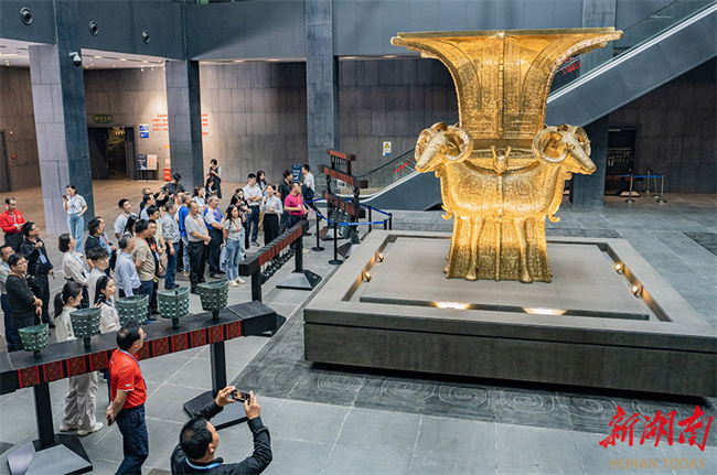 People admire the bronze ding with human-mask design, a national-level treasure cultural relic, at the Tanheli Bronze Museum in Ningxiang, Changsha on September 27. As Hunan's only museum dedicated to bronze culture, it houses a collection of 5,651 cultural relics, showcasing the brilliant bronze civilization in Ningxiang area during the Shang and Zhou periods (1600-256 B.C.). (Photo/Li Jian, Hunan Daily)