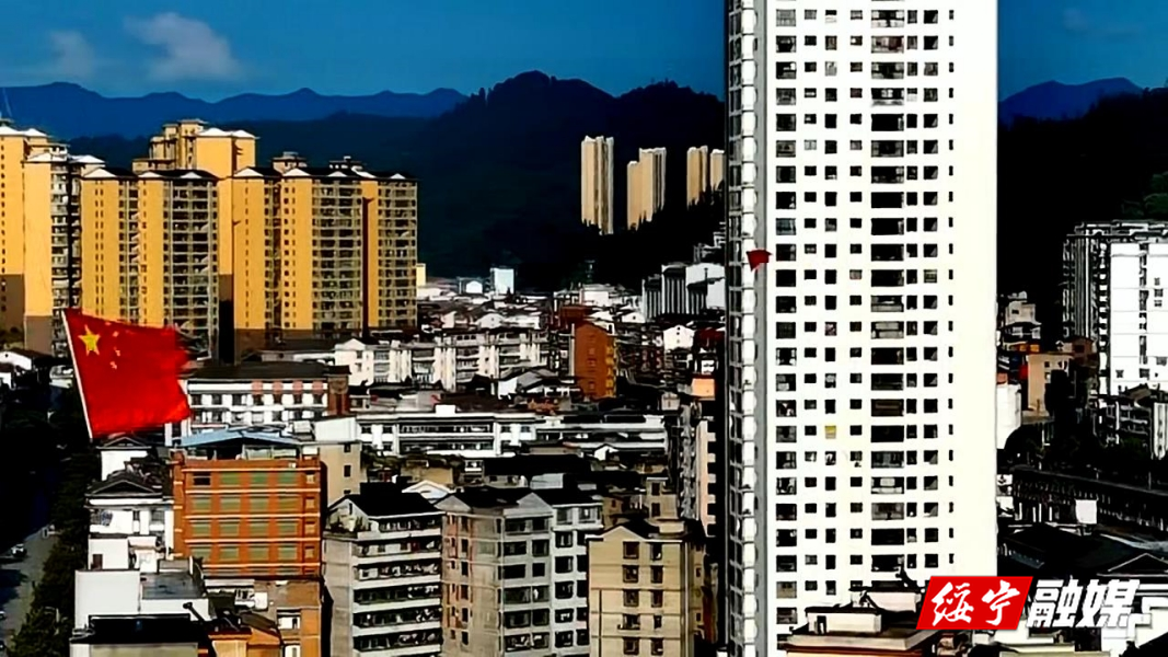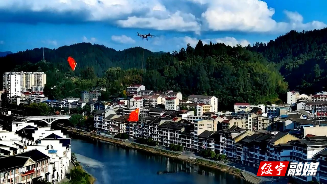 活动现场,数架无人机在飞手的精准操控下缓缓升空。一面巨大的五星红旗悬挂在大疆T100无人机下方,在巫水河上空徐徐展开。鲜艳的五星红旗与碧波荡漾的巫水河、两岸葱郁的青山、古色古香的建筑相互映衬,构成一幅壮美绚丽的画卷。无人机编队沿着巫水河前行,引得河畔群众纷纷驻足,大家或举起手机拍照,或欢呼喝彩,现场气氛热烈。