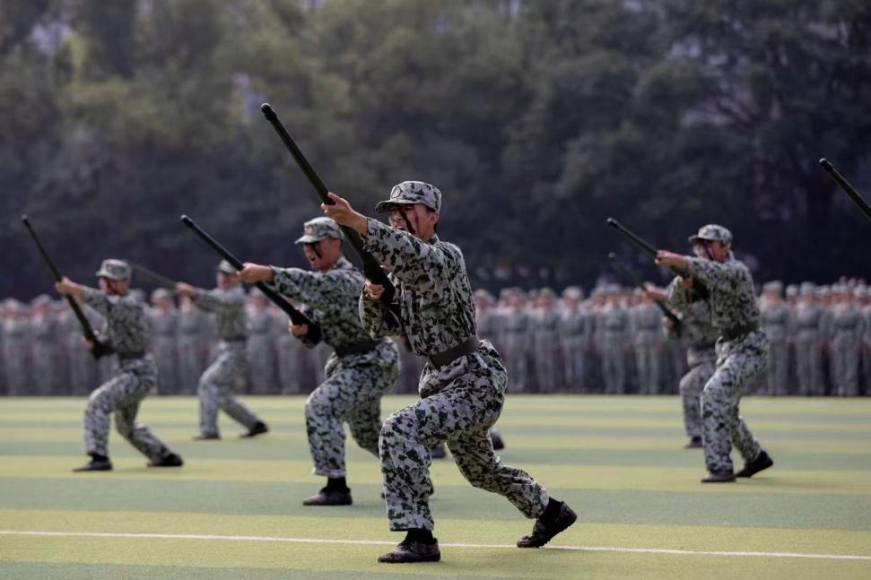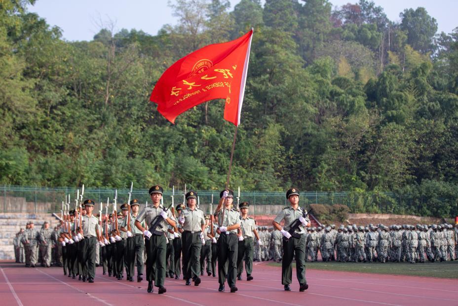 大会上,气势恢宏的红旗舞、破锋八刀、匕首操等特色方阵依次上场,现场红旗招展,掌声雷鸣,经久不息。伴随着慷慨激昂的《分列式进行曲》,来自22个学院的142支新生方队昂首阔步通过主席台,他们军姿挺拔、士气高昂、目光如炬,充分展现了军训的扎实成果和新时代大学生朝气蓬勃的精神风貌。