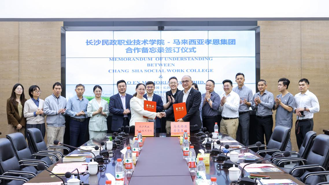 随后,在全体与会嘉宾的见证下,刘亚琴与朱兆祥共同签订合作备忘录,并互授“长沙民政职业技术学院—马来西亚孝恩集团交流培训中心”牌匾。该中心将作为双方常态化合作的实体平台,重点开展学生海外实习、师资联合培训、课程资源开发、生命教育推广等核心项目。