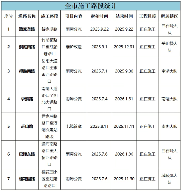岳阳县:1、国道G107: 新墙镇三合岔路口(9时—12时由北往南方向无法绕行,建议错开高峰期)、新开集镇三岔路口、新开镇九龙村十字路口;2、省道S308线游港路口90公里+300处;3、省道S310 56km+200m、荣公线14km+700m(8:30—12时此路段双向车流量大,双向易拥堵无法绕行,建议错开高峰期)、亿丰至林科所(城南路车流量大);4、国道G240:岳阳县麻塘集镇路段、岳阳县荣宝线交叉路口、亿丰至八仙桥路段(长丰路车流量大)、岳阳县麻塘洞庭美域路段;5、荣公线杨林乡城山舟路段(该路段在杨林集镇中国邮政银行处岔路口通往杨林村)、荣公线与省道S308交界处公田镇红绿灯处、柏祥镇十步桥村路段;6、荣家湾镇贺坪东路路段(修路,经过此路段请减速慢行)、荷花北路大圆岭菜市场路段(修路已封,请绕道而行)。