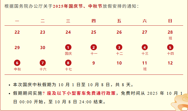 假期期间实施7 座及以下小型客车免费通行政策,免费时间从 2025 年 10 月 1 日 00:00 开始,至 10 月 8 日 24:00 结束。