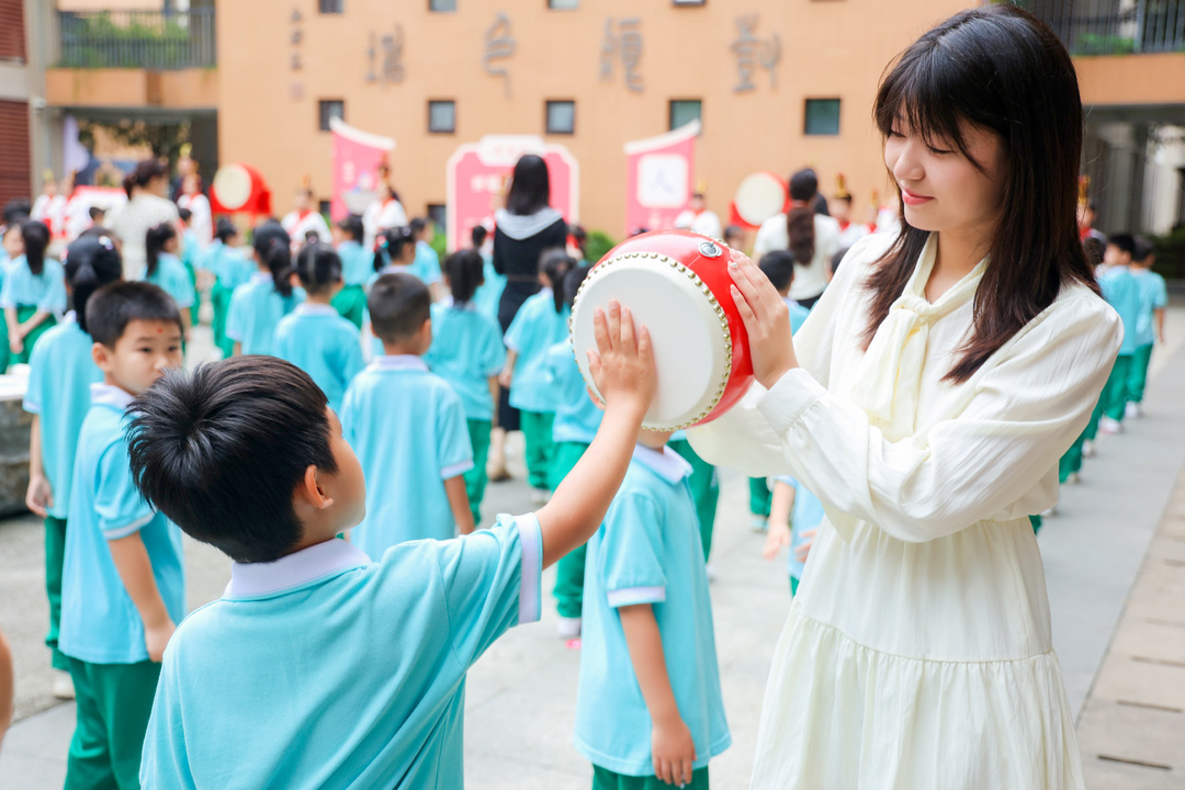 “击鼓明志”环节将仪式推向高潮。鼓声铿锵,声声入耳,学子们依次击鼓,立下远大志向。最后,在“启蒙描红”中,孩子们伸出小手,与老师一同书写简单而深远的“人”字,领悟“一撇一捺,立于天地”的为人之道。