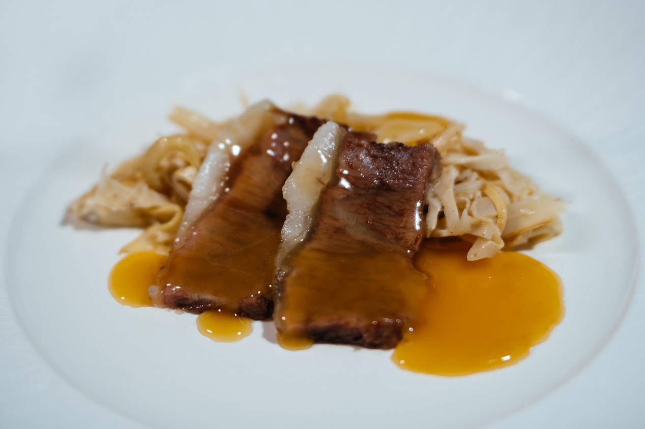 由中国烹饪大师贺俊贤领衔设计的晚宴主菜湘中黑牛排焖鸡汁糯米笋,精选涟源湘中黑牛生态牧场的安格斯牛肉与桃江糯米笋,佐以秘制鸡汁烹制。安格斯牛肉肉香浓郁,笋鲜透汁,完美诠释湘中丘陵的浑厚与资水流域的灵秀。这道融合中西烹饪智慧的菜品,生动展现了湘菜和而不同的文化包容性。