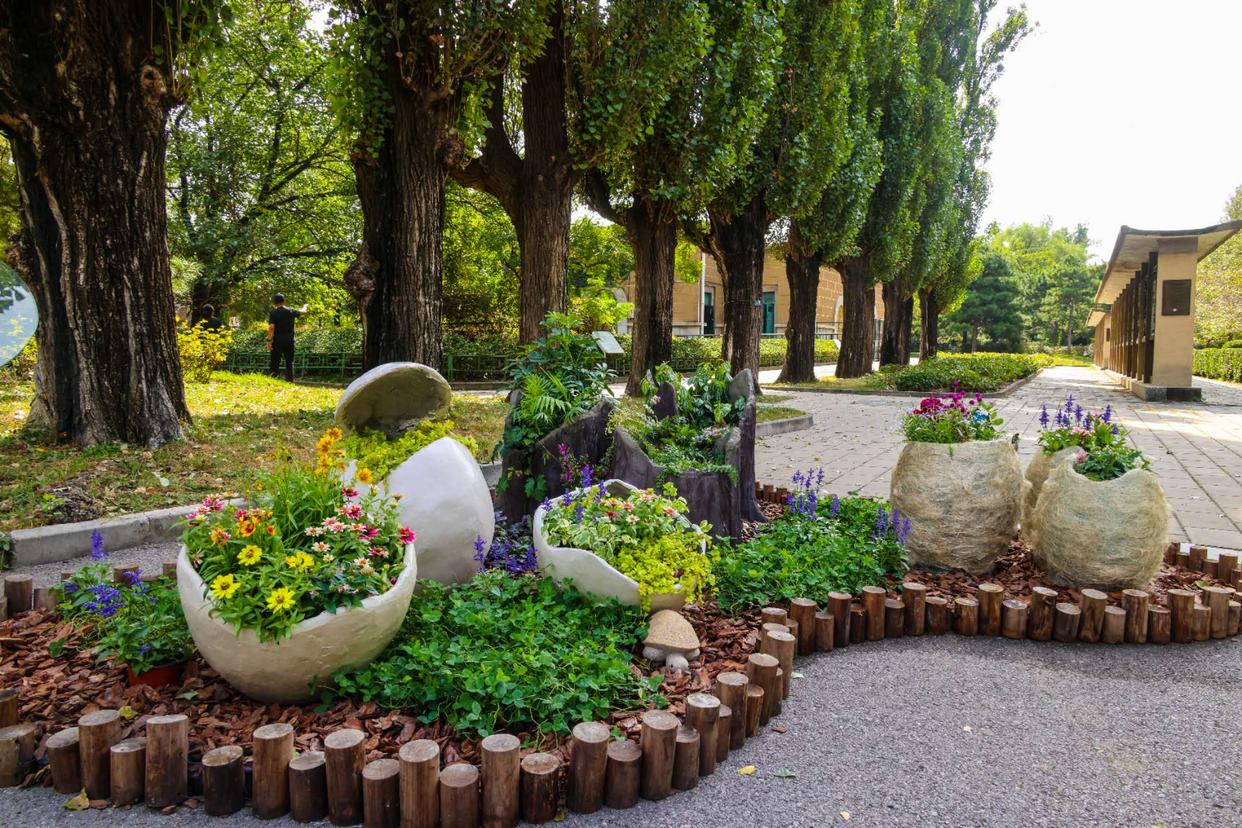 除此以外,“流光密坞”“生生不息”特色花钵用蚕蛹、蛋卵等造型搭配色彩、品种丰富的植物,展现了城市动物园特有的元素特点。同时将园林废弃物再循环利用,将已有的动物小品旧物翻新组合,点缀到全园地栽花卉景观中,环保理念拉满。