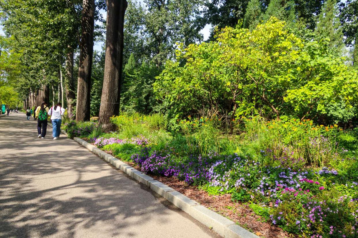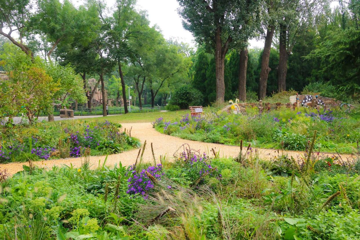 在北京动物园西北部直筒河北岸有一组“万生之缘”花境,花境设置了5个主题观赏点,分别以植物组团的形态语言演绎“谷麦”“桑蚕”“蔬菜”“果木”和“花卉”主题。通过植物高低错落的层次、四季轮换的景观变化,实现“人步入画、画随人动”,让游客步入其中体验沉浸式的悠然之意。