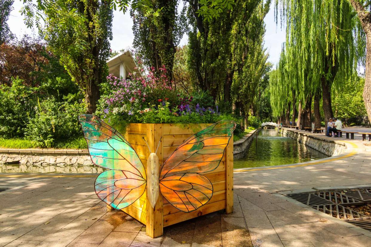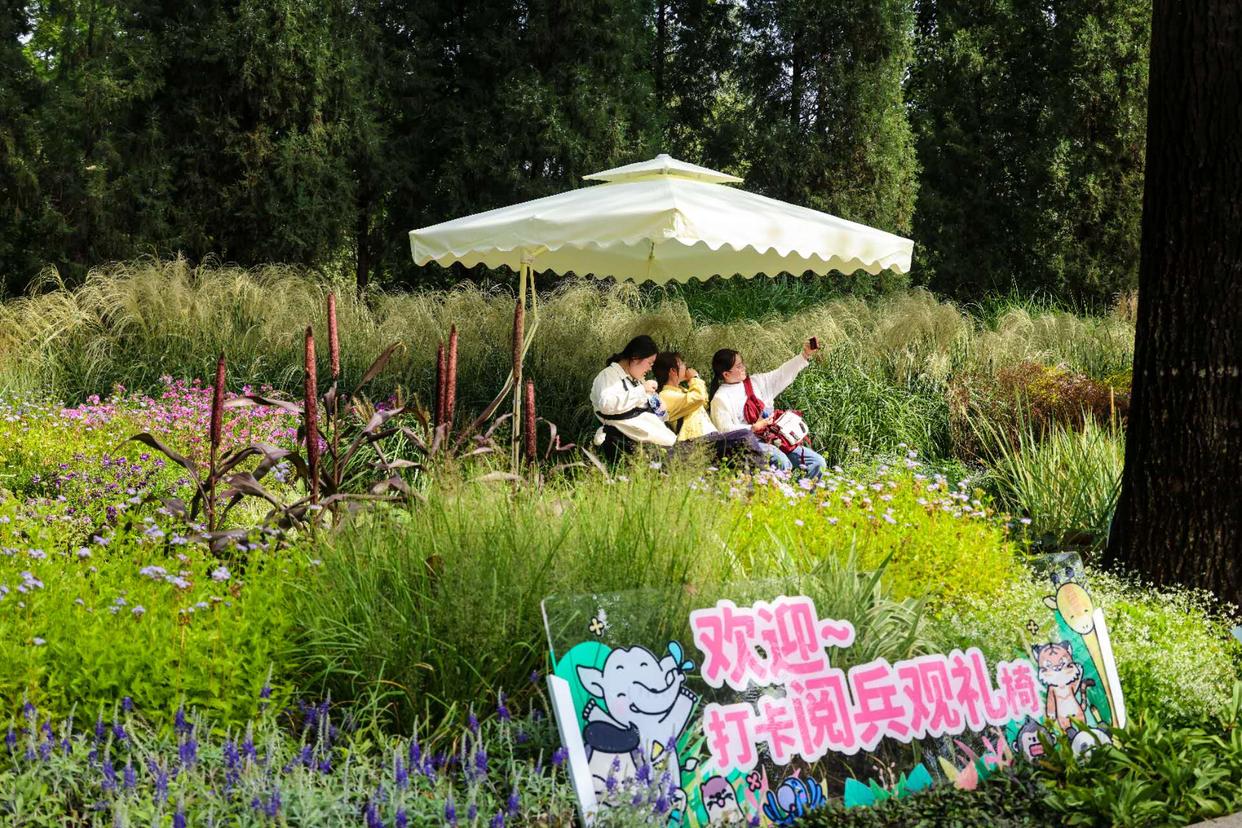 一组绿色的天安门广场观礼椅添置其中,上面搭配一把遮阳伞,地面彩绘“彩蝶之舞”,与宿根花卉相映成趣,一经搭建便立刻吸引来游客拍照留念,成为了“最美打卡地”。