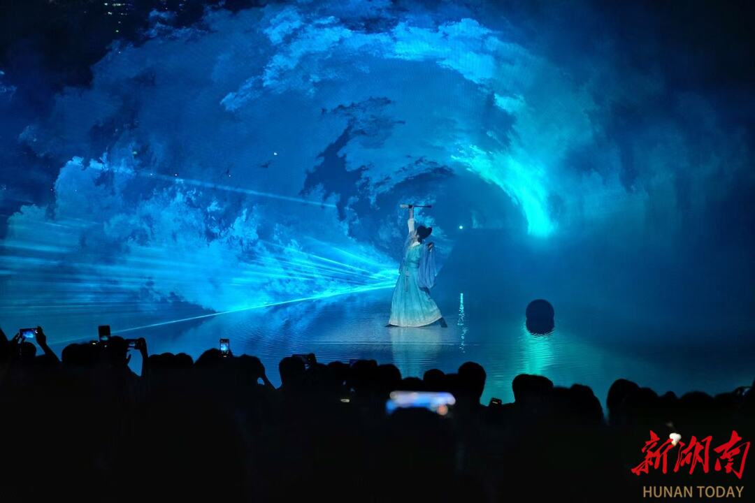 演出运用 3D Mapping、立体音效、智能灯光编程等先进技术,构建大型环幕、天幕、地屏与纱幕系统,将声、光、水、雾、电等元素融合运用,让《潇湘八景》画卷“活化”为动态景观。