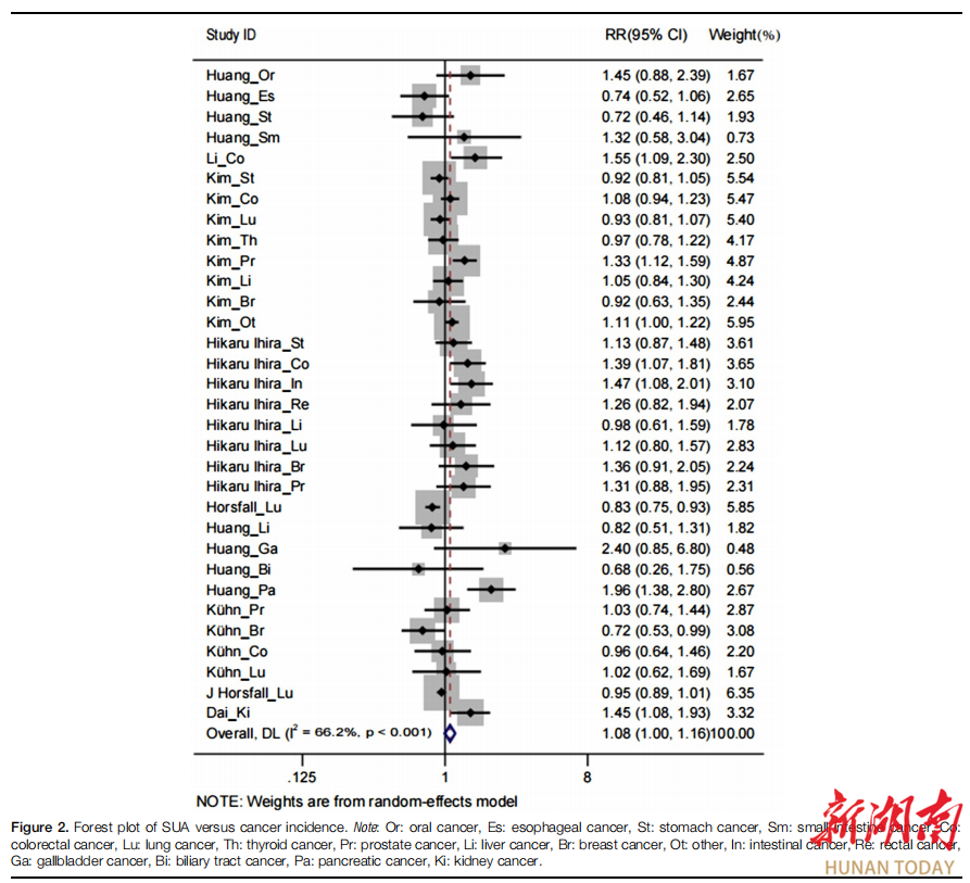 研究结果显示,尽管高血清尿酸水平在总体人群中与癌症发病率无显著相关性(RR: 1.08; 95%CI: 1.00,1.16),但在性别分层研究中发现女性人群中关联更强(RR=1.20)。此外,SUA与前列腺癌风险呈正相关,而与肺癌风险呈负相关。在癌症预后方面,高SUA水平与患者总生存期较差显著相关(RR: 1.81; 95%CI: 1.37,2.37),尤其在乳腺癌和非小细胞肺癌患者中更为明显。SUA与肿瘤发病率的关系如下: