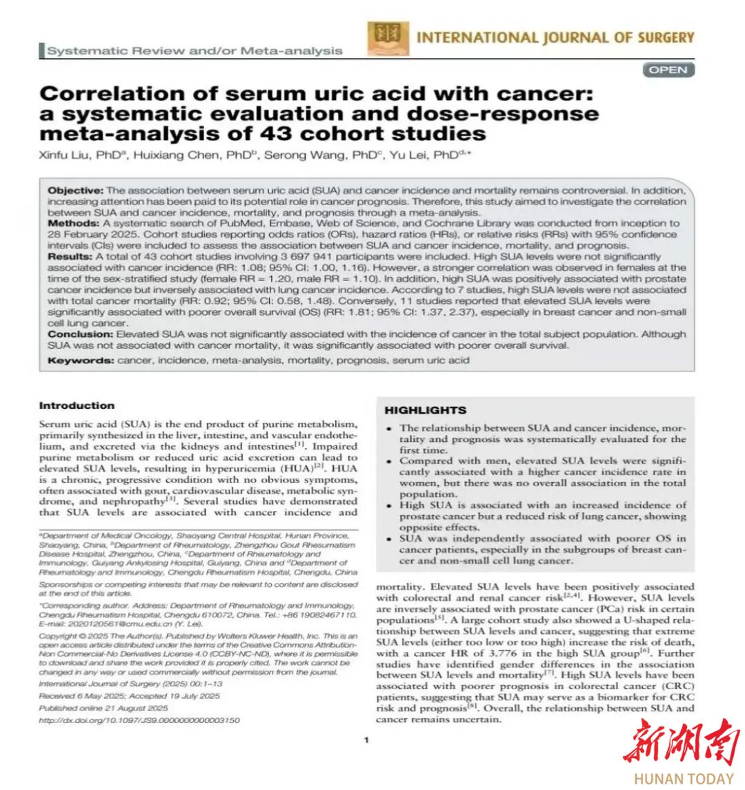 大众卫生报·新湖南客户端9月29日讯(通讯员 廖江敏)近日,邵阳市中心医院肿瘤科刘新福主任团队在血清尿酸与癌症关联研究领域取得重要进展,其撰写的论文《Correlation of serum uric acid with cancer: a systematic review and dose-response meta-analysis of 43 cohort studies》(译名:血清尿酸与癌症的相关性:一项涵盖43项队列研究的系统评价与剂量反应Meta分析)已于国际顶级学术期刊《International Journal of Surgery》(国际外科学杂志)正式发表,JCI分区为1区,SCI影响因子10.1分!