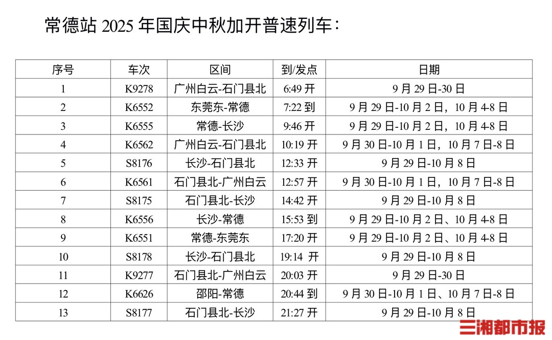 三湘都市报·新湖南客户端9月29日讯(全媒体记者 李致远 通讯员 刘凯明)9月29日,记者从常德火车站获悉,为应对国庆中秋黄金周客流高峰,9月29日至10月9日将增开39趟临客列车,包括13趟普速列车和26趟高铁列车,其中13趟高铁为夜间班次。