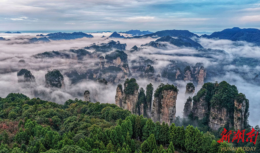 9月29日傍晚,张家界武陵源黄石寨景区雨后云海翻腾,群峰若隐若现,宛如仙境。 彭斌 摄(湖南图片库)