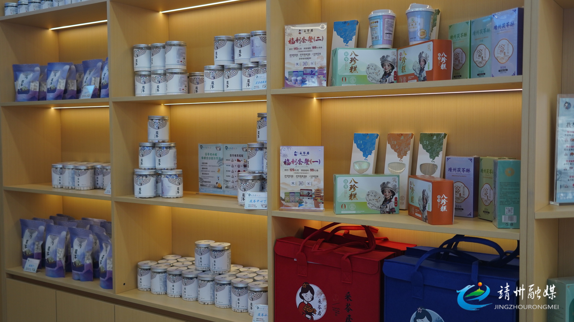 ▲货架上整齐摆放着各类茯苓产品(蒲湘萍 摄)