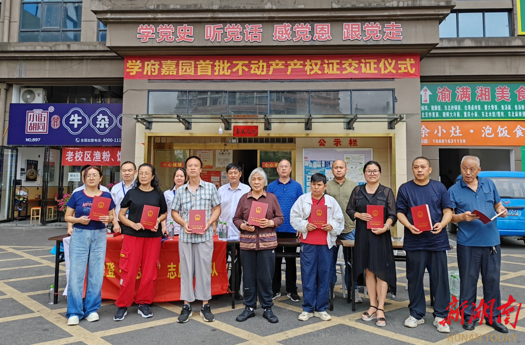 新湖南客户端9月30日讯(通讯员 符义勇)9月29日下午,湘西土家族苗族自治州吉首市学府嘉园小区内热闹非凡,吉首市自然资源局设立的不动产登记办证服务点前,业主们有序排队,期待着拿到心心念念的不动产权证。当天,吉首市不动产登记中心现场为小区业主办理登记手续,并集中发放该小区首批不动产权证书51本,让多年的“办证难题”画上圆满句号。