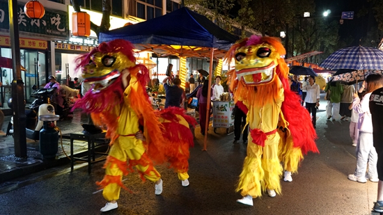 除了舌尖上让人垂涎的地道美味,溪畔夜市更精心注入了丰富的文创元素与互动体验,为夜间游玩增添别样趣味,也让游客深入感受当地文化。这边刚因美食勾起食欲,那边的舞狮巡游、音乐演出便已轮番登场,瞬间将夜市的热闹气氛推向高潮。