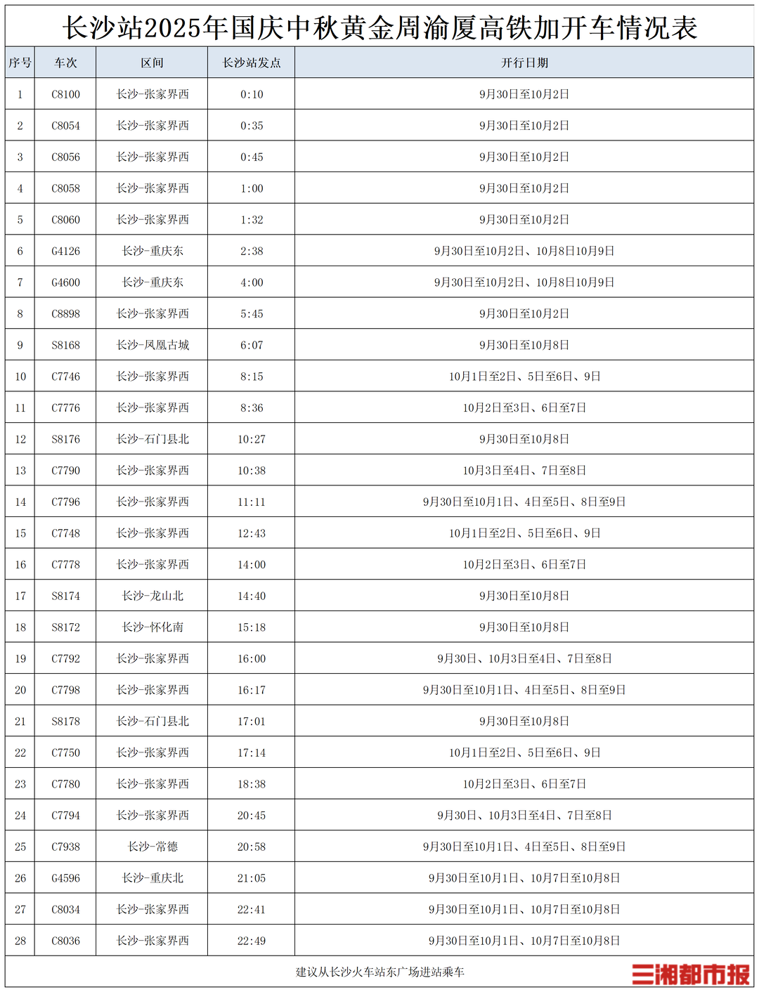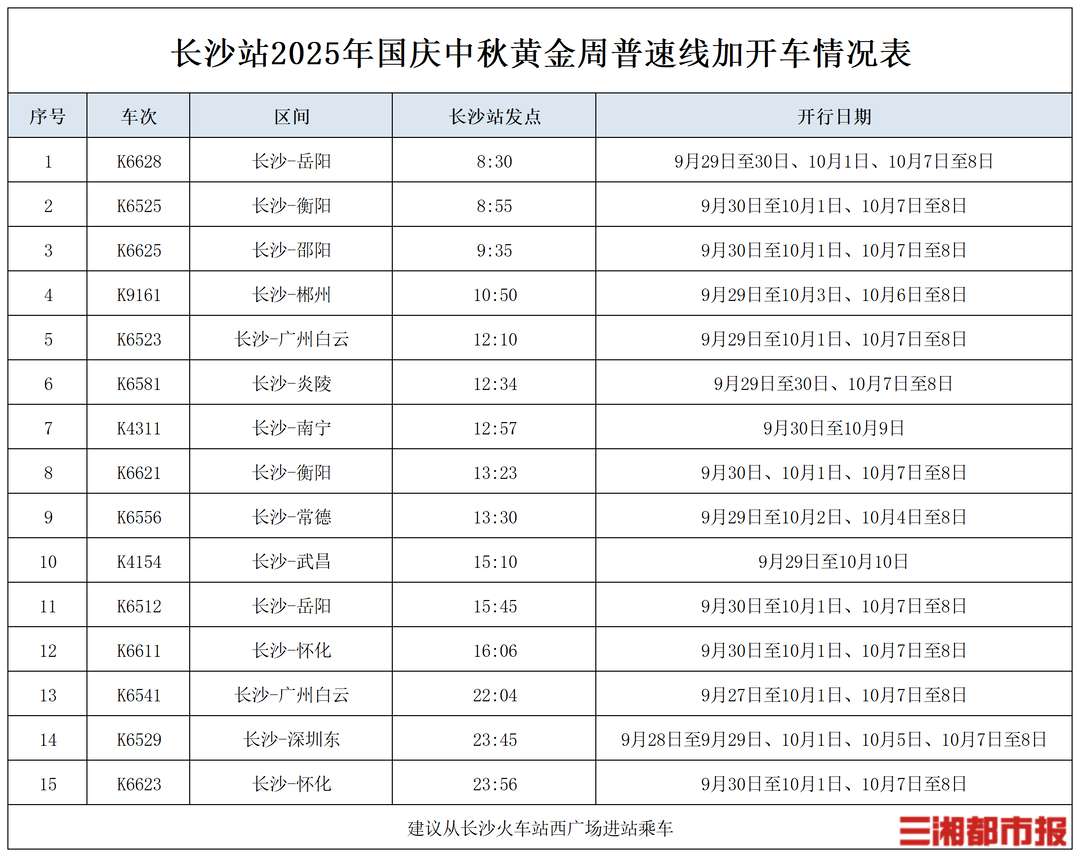 为满足广大旅客出行需求,长沙火车站根据客流情况,加开省内岳阳、衡阳、邵阳、郴州、炎陵、常德、怀化、张家界、凤凰、石门县、龙山等方向,省外广州、南宁、武昌、深圳、重庆等客流热门方向列车。普速线加开列车15列;渝厦高铁加开列车28列,其中包括张家界、重庆方向夜间高铁11趟,努力满足旅客乘车出行需求。
