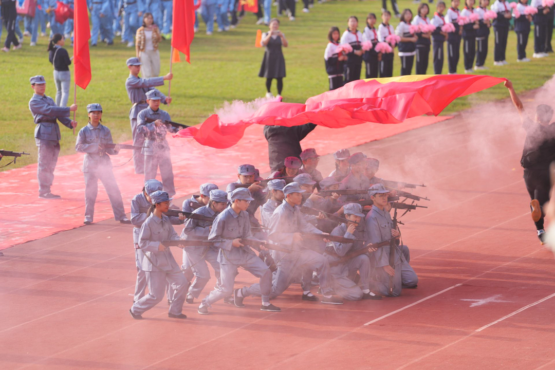 开幕式最精彩的是各个方阵的精彩展示。初一年级方阵以“星星之火 可以燎原”的革命题材为创意,他们手举闪亮的五角星在阳光下熠熠生辉;初二年级方阵组成了一支“红军”队伍,模拟种种作战场景,这个充满红色气息的创意表演,既呼应了爱国主义教育主题,又彰显了新时代少年的蓬勃朝气;初三年级方阵手持饱满麦穗和丰收花篮,宛如一片金色的麦浪在风中起伏;高一年级方阵摇动着鲜艳的五星红旗入场,场面热烈而欢快;高二年级方阵的舞龙舞狮震撼全场,两条巨龙在他们手中翻腾起舞,同学们默契配合,或腾挪跳跃,或摇头摆尾,活灵活现;高三年级方阵踏着欢快的节奏,用朗诵和歌声深情表白祖国,在秋风中形成了一片涌动的浪潮。