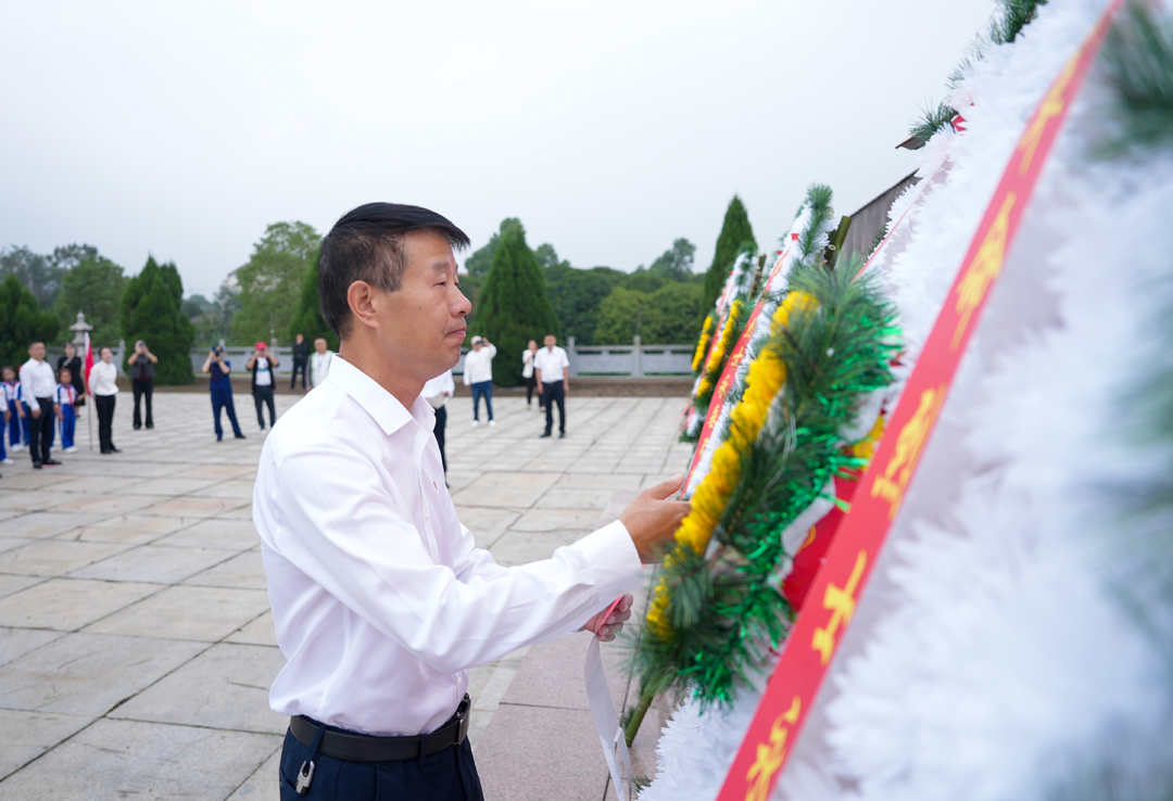 屈原管理区党委书记向科军神情庄重,缓步上前,仔细整理花篮缎带,表达对革命先烈最崇高的敬意。