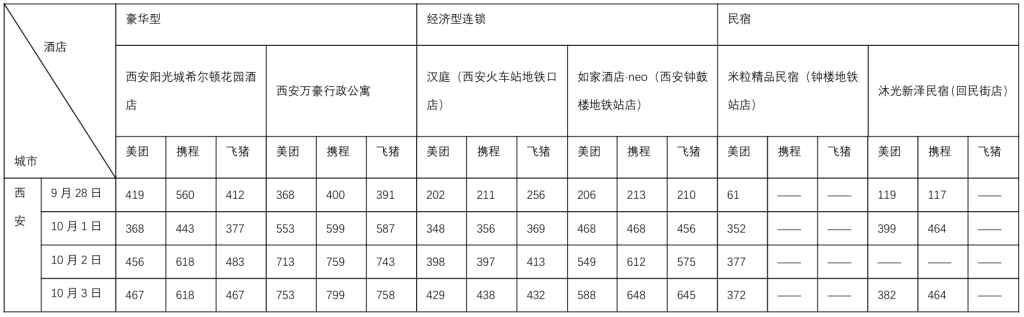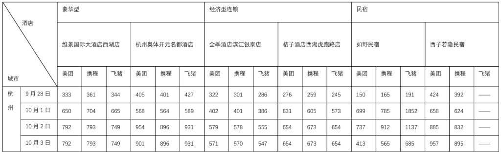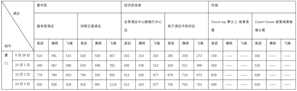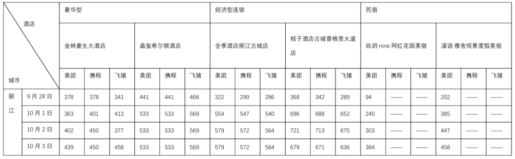 9月28日至国庆假期前三天十大热门旅游城市部分酒店价格对比:
