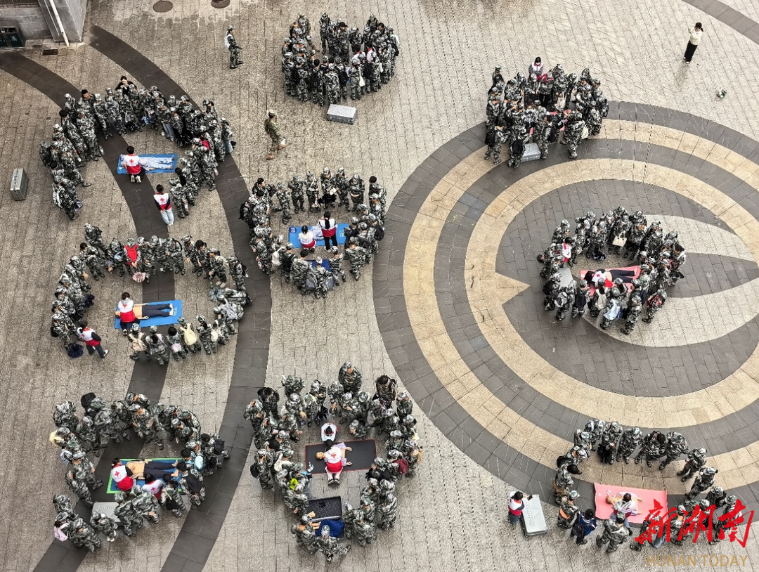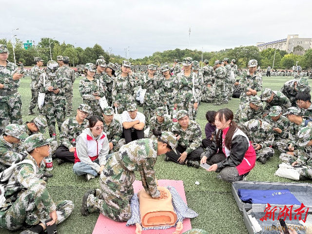 “双手交叉按压,深度至少5厘米,频率保持在每分钟100—120次……”在南华大学2025级新生军训现场,护理学院红十字会志愿者正手把手指导新生进行心肺复苏实操训练。近日,南华大学面向2025级全体本科新生开展心肺复苏(CPR)急救知识专项培训,覆盖学生近1万人。